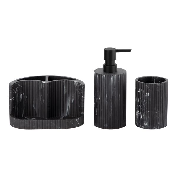 Black Marble Print Polyresin Bathroom Accessories Set Ribbed Vertical Fringe Soap Dispenser Tumbler Accessories Tray Images |